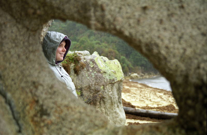 Edel on a swing bridge near the Wainui falls in the Abel Tasman national park.