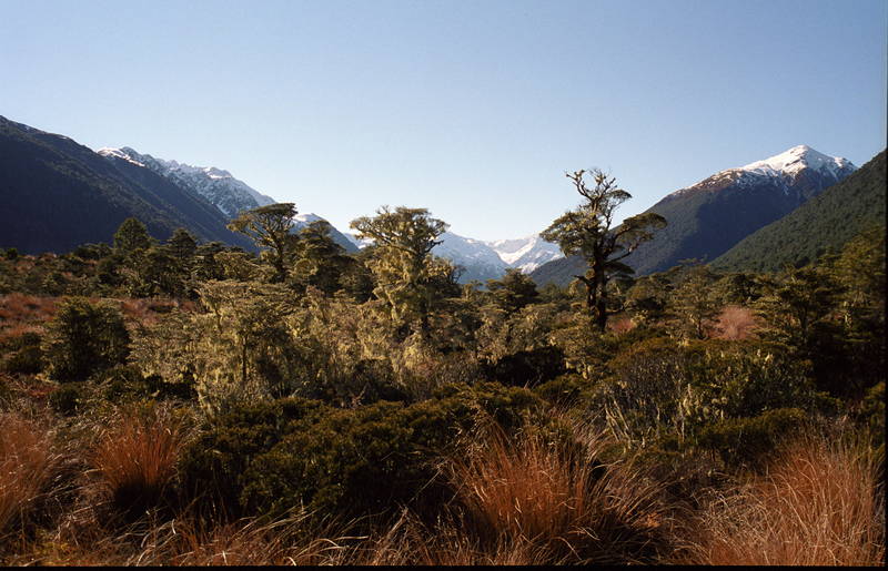 Trees full of lichen by Lewis Pass, central south island New Zealand.