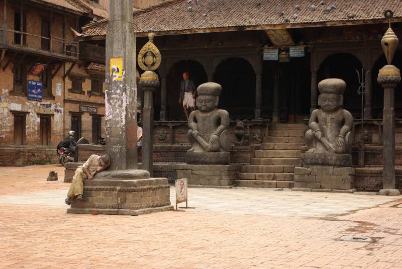Stone guardians by a temple in Bhaktapur.