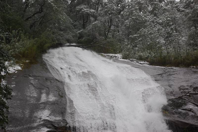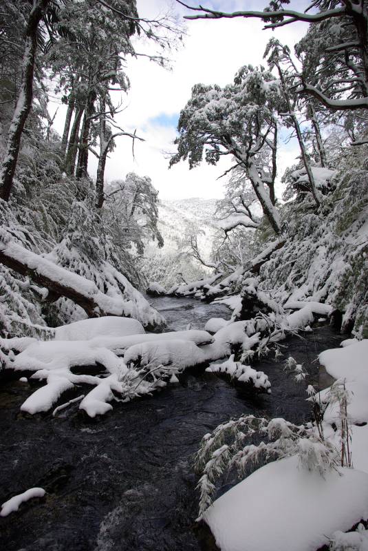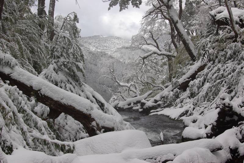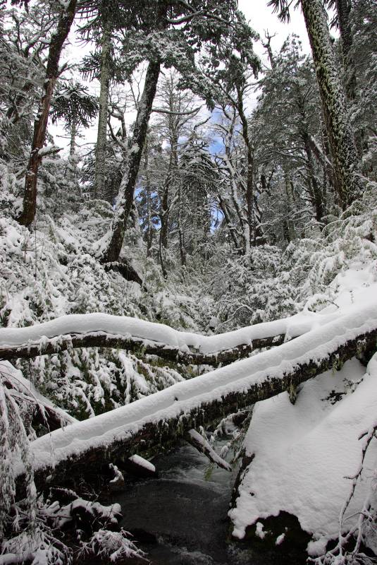 Snowy bridge in the Huerquehue national park.