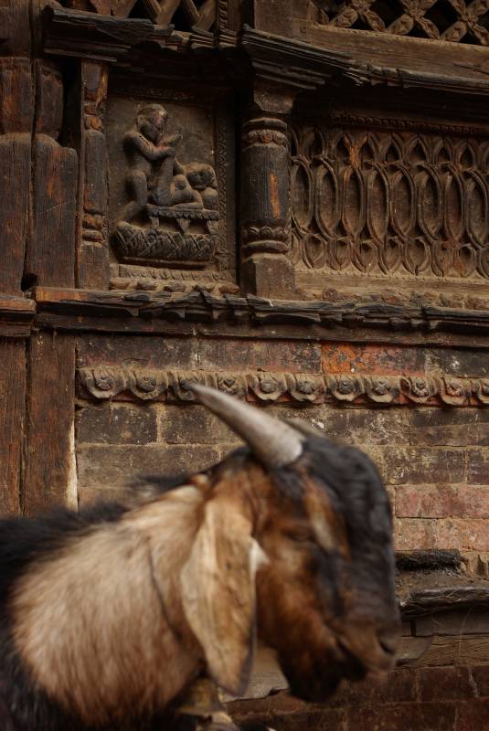 Goats and wood carvings by a temple in Bhaktapur.