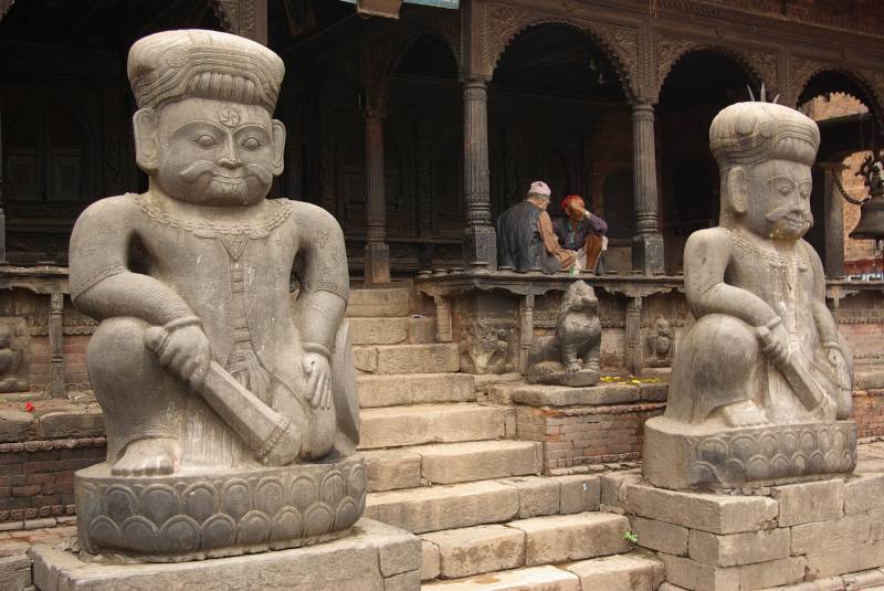 Stone guardians by a temple in Bhaktapur.